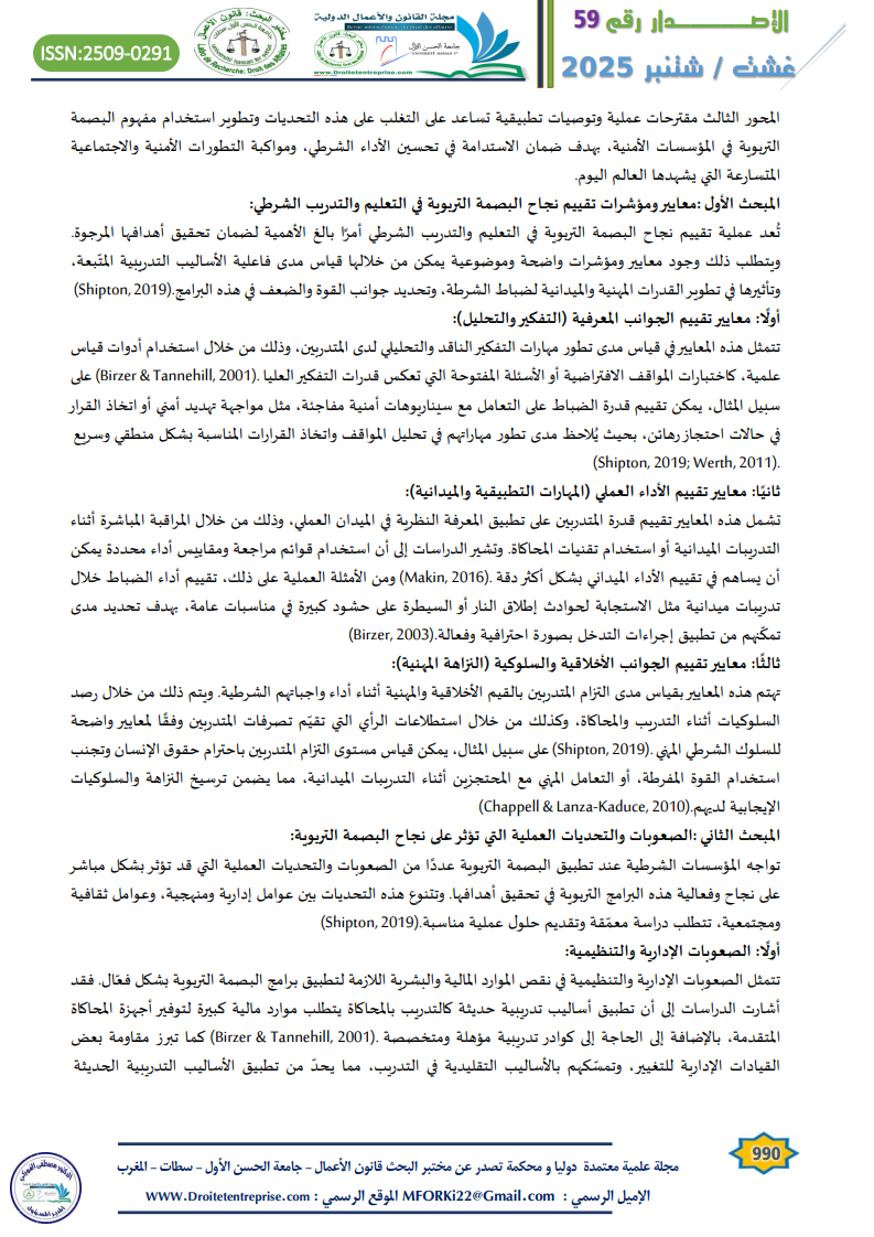 تُعد عملية تقييم نجاح البصمة التربوية في التعليم والتدريب الشرطي أمرًا بالغ الأهمية لضمان تحقيق أهدافها المرجوة. ويتطلب ذلك وجود معايير ومؤشرات واضحة وموضوعية يمكن من خلالها قياس مدى فاعلية الأساليب التدريبية المتّبعة، وتأثيرها في تطوير القدرات المهنية والميدانية لضباط الشرطة، وتحديد جوانب القوة والضعف في هذه البرامج (Shipton, 2019).