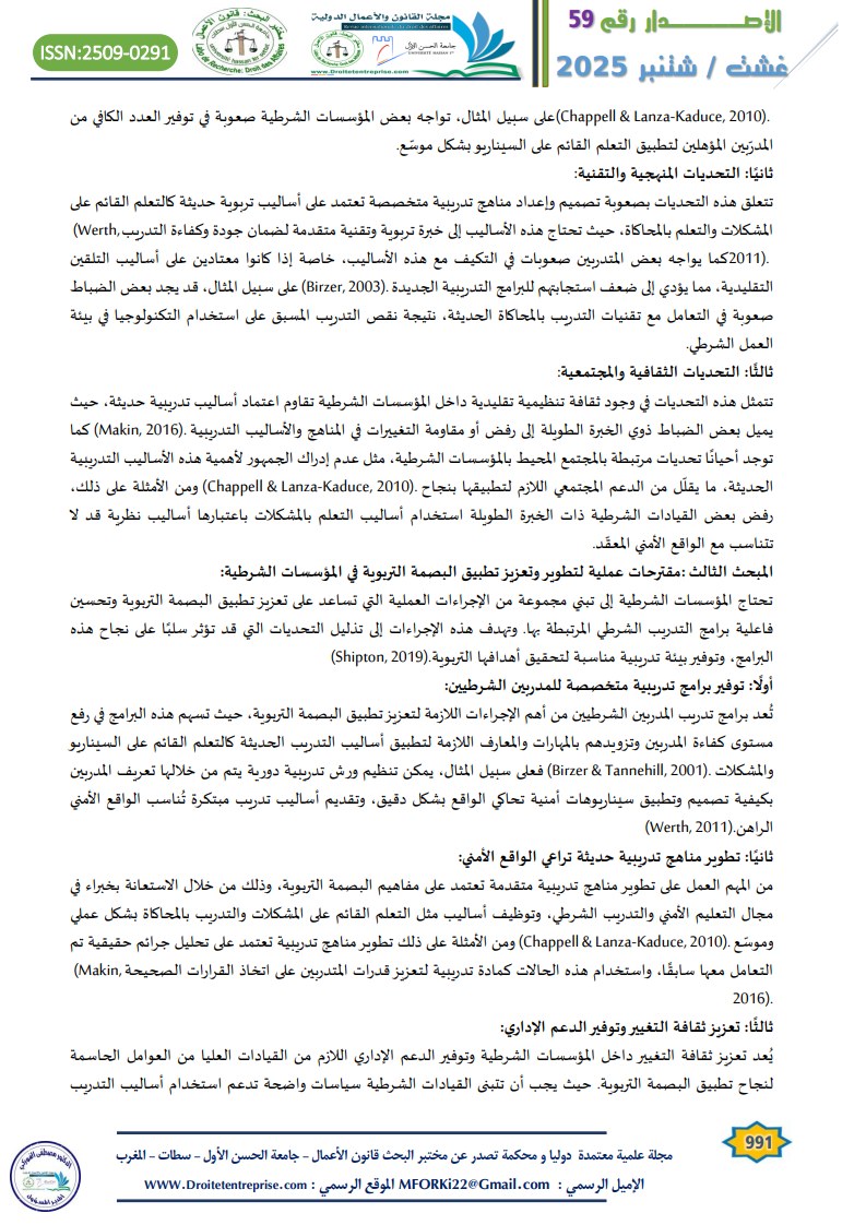 يُعد تعزيز ثقافة التغيير داخل المؤسسات الشرطية وتوفير الدعم الإداري اللازم من القيادات العليا من العوامل الحاسمة لنجاح تطبيق البصمة التربوية. حيث يجب أن تتبنى القيادات الشرطية سياسات واضحة تدعم استخدام أساليب التدريب الحديثة، وتشجع المتدربين على المشاركة الفعالة في هذه البرامج، وتُزيل أي مقاومة أو تخوّف من تطبيق التغيير (Birzer, 2003). فعلى سبيل المثال، يمكن إنشاء برامج توعوية وحلقات نقاشية للقادة والمدربين، تُبرز فوائد التدريب الحديث وتؤكد على ضرورة تبنّي أساليب التدريب بالمحاكاة والتعلم القائم على السيناريو كجزء أساسي من منظومة التدريب الشرطي (Shipton, 2019).