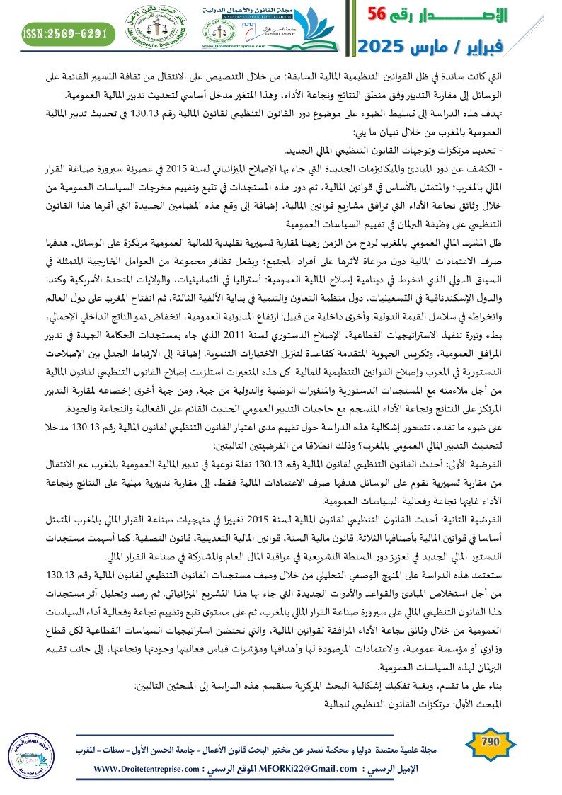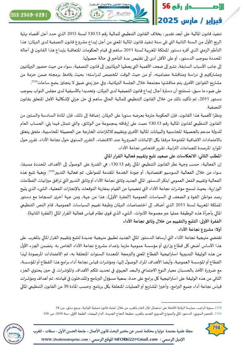The study aimed to monitor the role of Finance Organic Law No. 130. 13 of 2015 in modernizing finances public management in Morocco, by defining the philosophy and foundations of this new financial regulatory law, then revealing the role of the new principles and mechanisms that it came in, and analyzing their role in modernizing the financial decision-making process in Morocco, represented mainly in the finance laws, and then the role of these developments in tracking and evaluating the outputs of the budget policy through performance efficiency documents that accompany the draft finance laws, in addition to These new provisions affect the function of parliament in evaluating public policies.