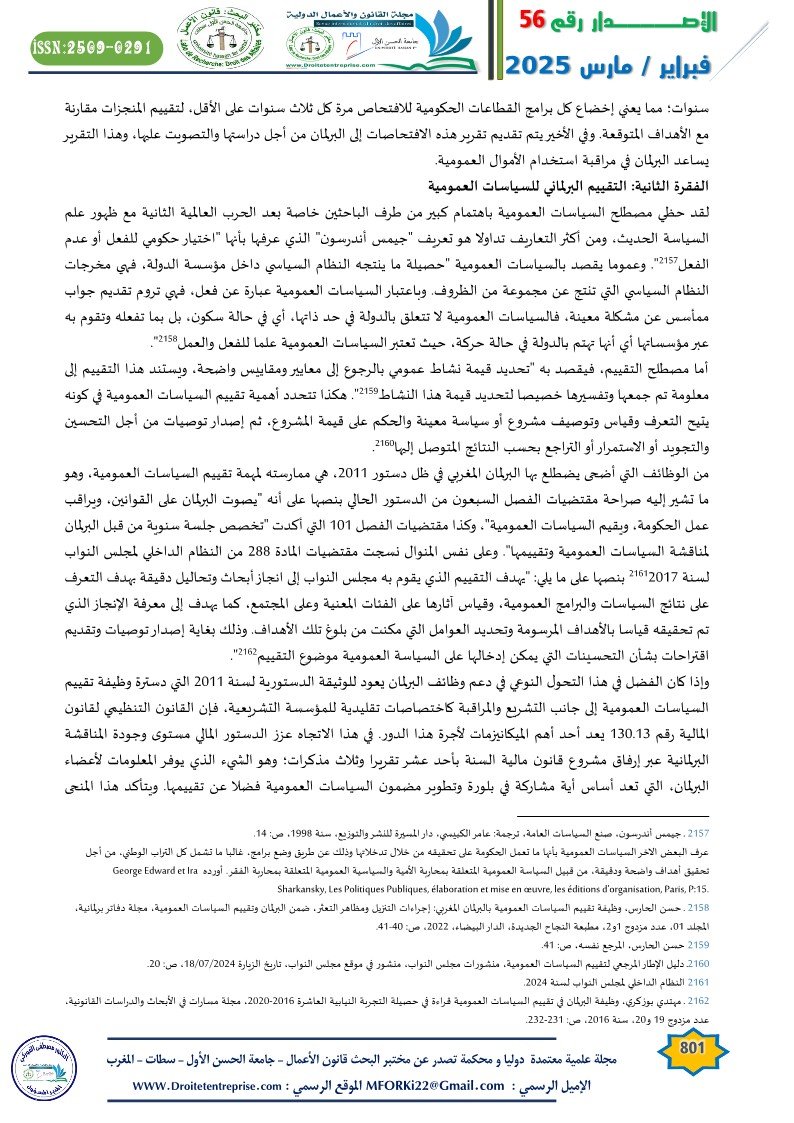 وإذا كان الفضل في هذا التحول النوعي في دعم وظائف البرلمان يعود للوثيقة الدستورية لسنة 2011 التي دسترة وظيفة تقييم السياسات العمومية إلى جانب التشريع والمراقبة كاختصاصات تقليدية للمؤسسة التشريعية، فإن القانون التنظيمي لقانون المالية رقم 130.13 يعد أحد أهم الميكانيزمات لأجرة هذا الدور. في هذا الاتجاه عزز الدستور المالي مستوى وجودة المناقشة البرلمانية عبر إرفاق مشروع قانون مالية السنة بأحد عشر تقريرا وثلاث مذكرات؛ وهو الشيء الذي يوفر المعلومات لأعضاء البرلمان، التي تعد أساس أية مشاركة في بلورة وتطوير مضمون السياسات العمومية فضلا عن تقييمها. ويتأكد هذا المنحى المكرس لمهمة تقييم السياسات العمومية من خلال ضرورة إعداد مشروع نجاعة الأداء من قبل كل قطاع وزاري ومؤسسة عمومية، وتقديمه رفقة مشروع ميزانية القطاع الوزاري أو المؤسسة المذكورة إلى اللجنة البرلمانية المعنية. ثم يتم، بناء على حصيلة تنفيذ الميزانية خلال السنة المالية، إعداد التقرير السنوي حول نجاعة الأداء من لدن الوزارة المكلفة بالمالية؛ وهذا الأخير يقوم بتلخيص ومركزة تقارير نجاعة أداء القطاعات الوزارية والمؤسسات، ثم إرفاقه بمشروع قانون التصفية . ولم يقف الأمر عند هذا الحد، فالمؤسسة التشريعية تستفيد من وثائق أخرى تساعدها في مهمة تقييم السياسات العمومية، ويتعلق الأمر بالوثائق المرافقة لمشروع قانون التصفية السابق المشار إليها سابقا.