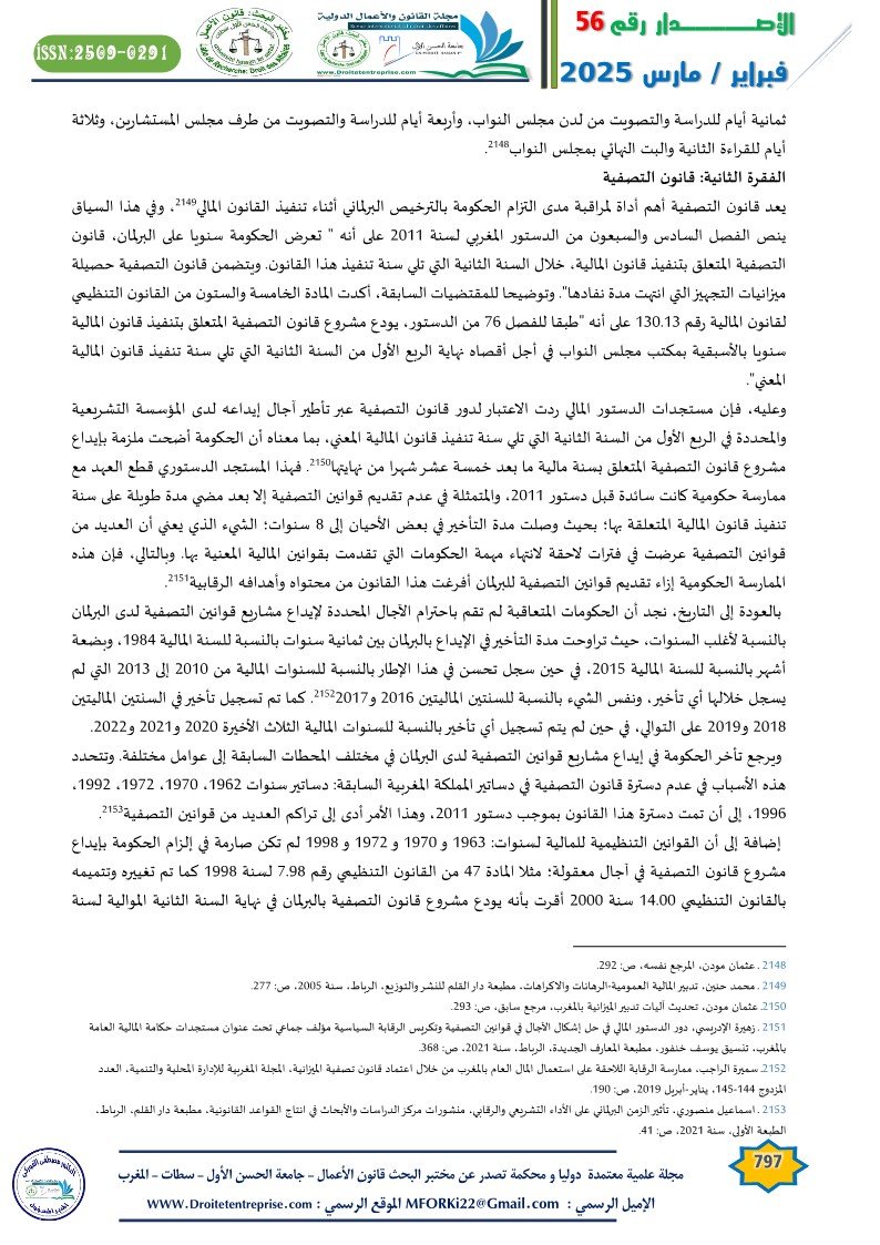 وعليه، فإن مستجدات الدستور المالي ردت الاعتبار لدور قانون التصفية عبر تأطير آجال إيداعه لدى المؤسسة التشريعية والمحددة في الربع الأول من السنة الثانية التي تلي سنة تنفيذ قانون المالية المعني، بما معناه أن الحكومة أضحت ملزمة بإيداع مشروع قانون التصفية المتعلق بسنة مالية ما بعد خمسة عشر شهرا من نهايتها . فهذا المستجد الدستوري قطع العهد مع ممارسة حكومية كانت سائدة قبل دستور 2011، والمتمثلة في عدم تقديم قوانين التصفية إلا بعد مضي مدة طويلة على سنة تنفيذ قانون المالية المتعلقة بها؛ بحيث وصلت مدة التأخير في بعض الأحيان إلى 8 سنوات؛ الشيء الذي يعني أن العديد من قوانين التصفية عرضت في فترات لاحقة لانتهاء مهمة الحكومات التي تقدمت بقوانين المالية المعنية بها. وبالتالي، فإن هذه الممارسة الحكومية إزاء تقديم قوانين التصفية للبرلمان أفرغت هذا القانون من محتواه وأهدافه الرقابية .