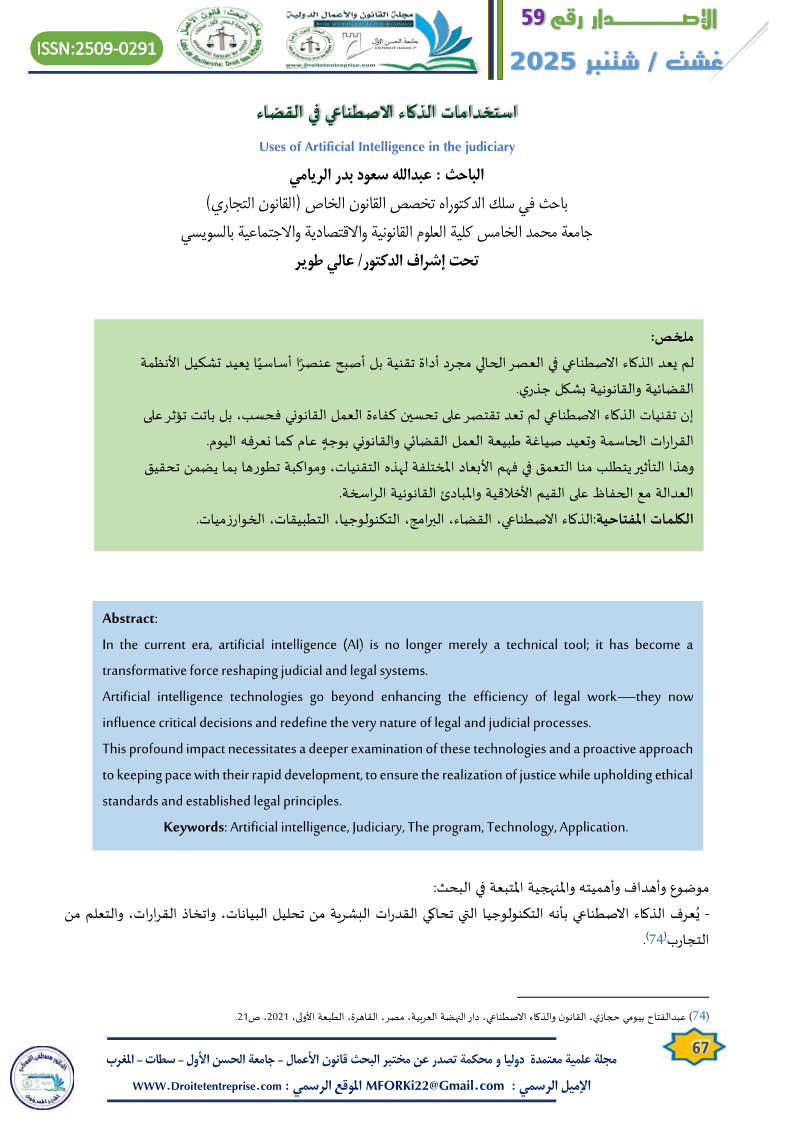 استخدامات الذكاء الاصطناعي في القضاء – الباحث : عبدالله سعود بدر الريامي – تحت إشراف الدكتور/ عالي طوير