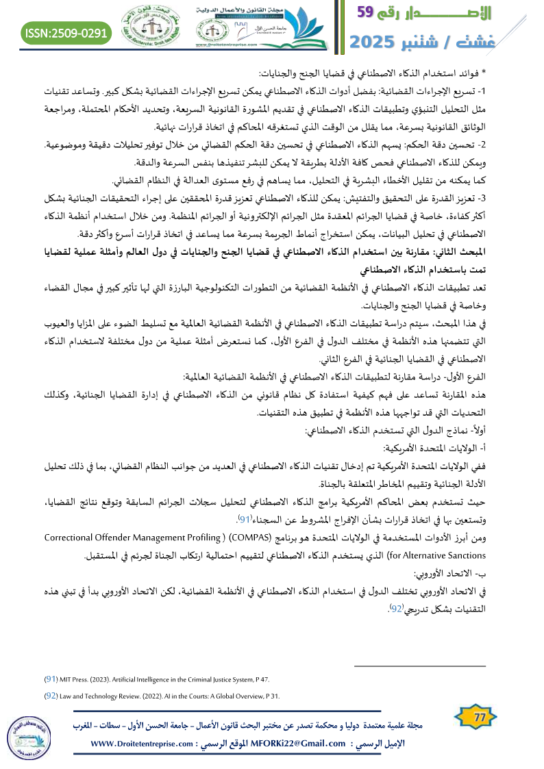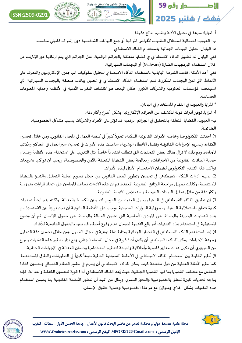 5) تُظهر المقارنة بين استخدام الذكاء الاصطناعي في الأنظمة القضائية العالمية تنوعاً كبيراً في التطبيقات والطرق المستخدمة. كما تظهر الأمثلة العملية من دول مختلفة كيف يمكن للذكاء الاصطناعي أن يسهم في تطوير النظام القضائي وتحسين كفاءة التعامل مع مختلف القضايا بما فيها القضايا الجنائية. حيث يُعد الذكاء الاصطناعي أداة قوية لتحسين الكفاءة والعدالة، فإنه يواجه تحديات كبيرة تتعلق بالخصوصية والتحيز البشري. ويظل من المهم أن تتطور الأنظمة القانونية بما يضمن استخدام هذه التقنيات بشكل أخلاقي ومتوازن مع مراعاة الخصوصية وحماية حقوق الإنسان.