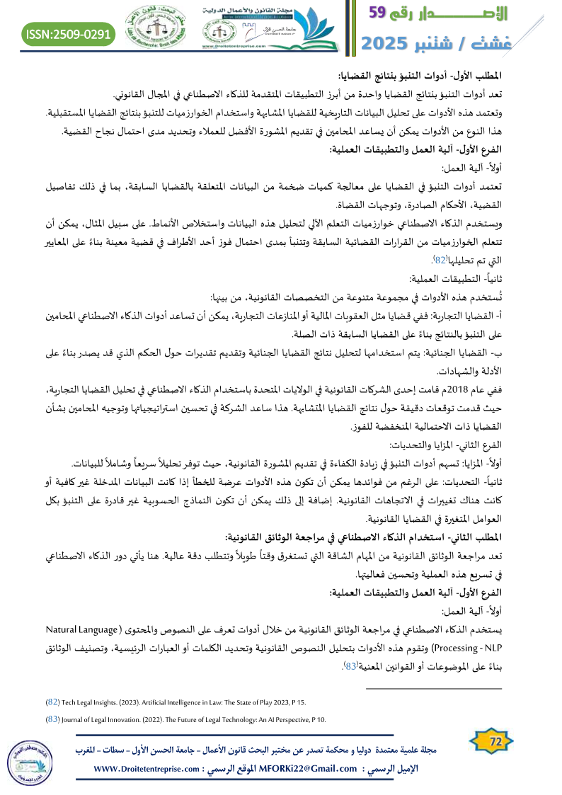 2) تسهم أدوات الذكاء الاصطناعي في تحسين وتطوير العمل القانوني من خلال تسريع عملية التحليل والتنبؤ بالقضايا المستقبلية، وكذلك تسهيل مراجعة الوثائق القانونية المعقدة. ثم أن هذه الأدوات تساعد المحامين على اتخاذ قرارات مدروسة وأكثر دقة من خلال تحليل البيانات الضخمة واستخلاص الأنماط القانونية.