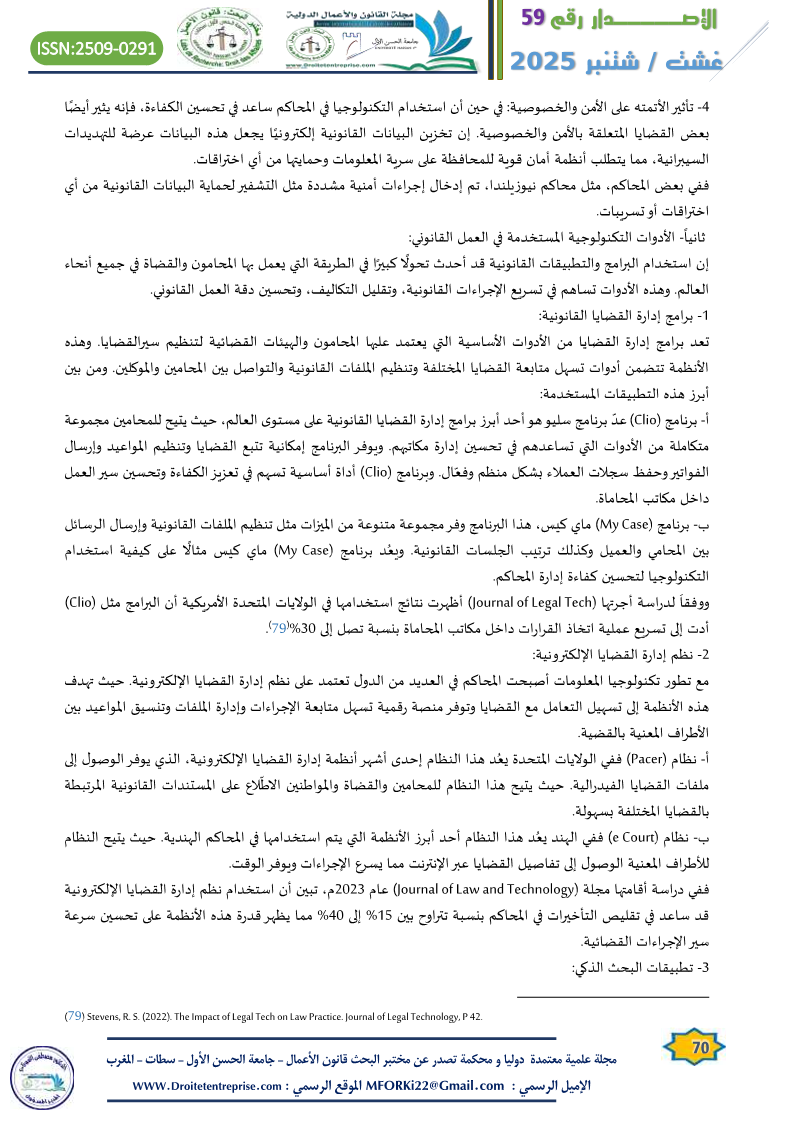 1) أحدثت التكنولوجيا وخاصة الأدوات القانونية الذكية، تحولاً كبيراً في كيفية العمل في المجال القانوني. ومن خلال تحسين الكفاءة وتسريع الإجراءات القانونية وتقليل الأخطاء البشرية، ساعدت هذه الأدوات في تحسين سير العمل في المحاكم ومكاتب المحاماة. ومع ذلك لا تزال هناك بعض التحديات التي تتطلب اهتماماً خاصاً مثل التدريب على استخدام هذه الأنظمة وضمان حماية البيانات القانونية من الاختراقات، ومعالجة بعض القضايا المتعلقة بالأمن والخصوصية، ويجب أن تواكبها تشريعات تواكب هذا التقدم التكنولوجي لضمان الاستخدام الأمثل لهذه الأدوات.