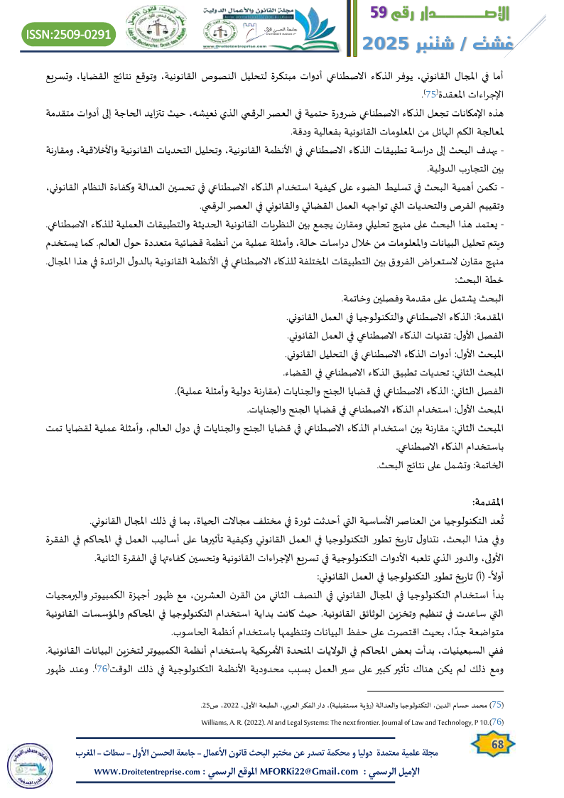 – يهدف البحث إلى دراسة تطبيقات الذكاء الاصطناعي في الأنظمة القانونية، وتحليل التحديات القانونية والأخلاقية، ومقارنة بين التجارب الدولية.