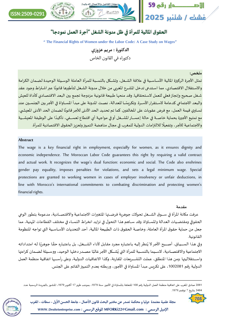 The wage is a key financial right in employment, especially for women, as it ensures dignity and economic independence. The Moroccan Labor Code guarantees this right by requiring a valid contract and actual work. It recognizes the wage’s dual function: economic and social. The Code also enshrines gender pay equality, imposes penalties for violations, and sets a legal minimum wage. Special protections are granted to working women in cases of employer insolvency or unfair deductions, in line with Morocco’s international commitments to combating discrimination and protecting women’s financial rights.