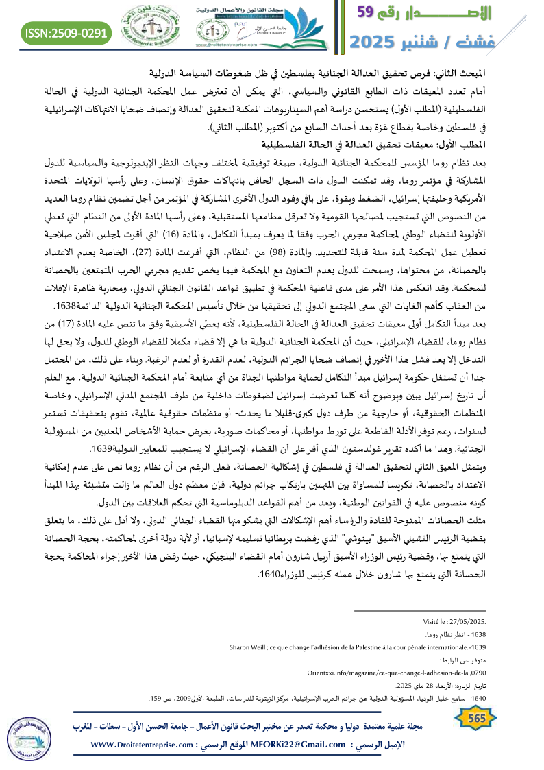 أمام تعدد المعيقات ذات الطابع القانوني والسياسي، التي يمكن أن تعترض عمل المحكمة الجنائية الدولية في الحالة الفلسطينية (المطلب الأول) يستحسن دراسة أهم السيناريوهات الممكنة لتحقيق العدالة وإنصاف ضحايا الانتهاكات الإسرائيلية في فلسطين وخاصة بقطاع غزة بعد أحداث السابع من أكتوبر (المطلب الثاني).