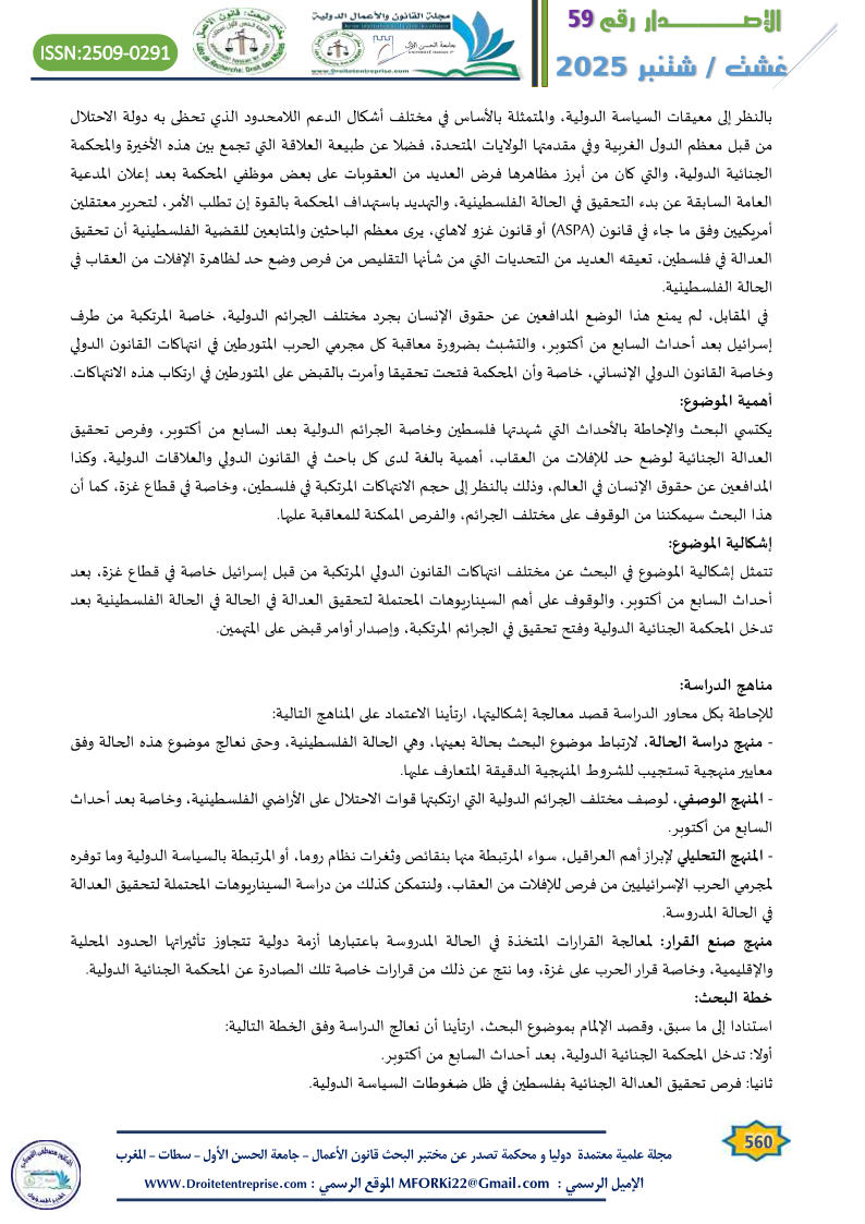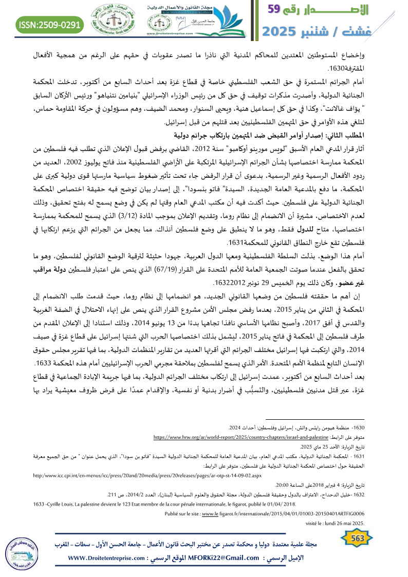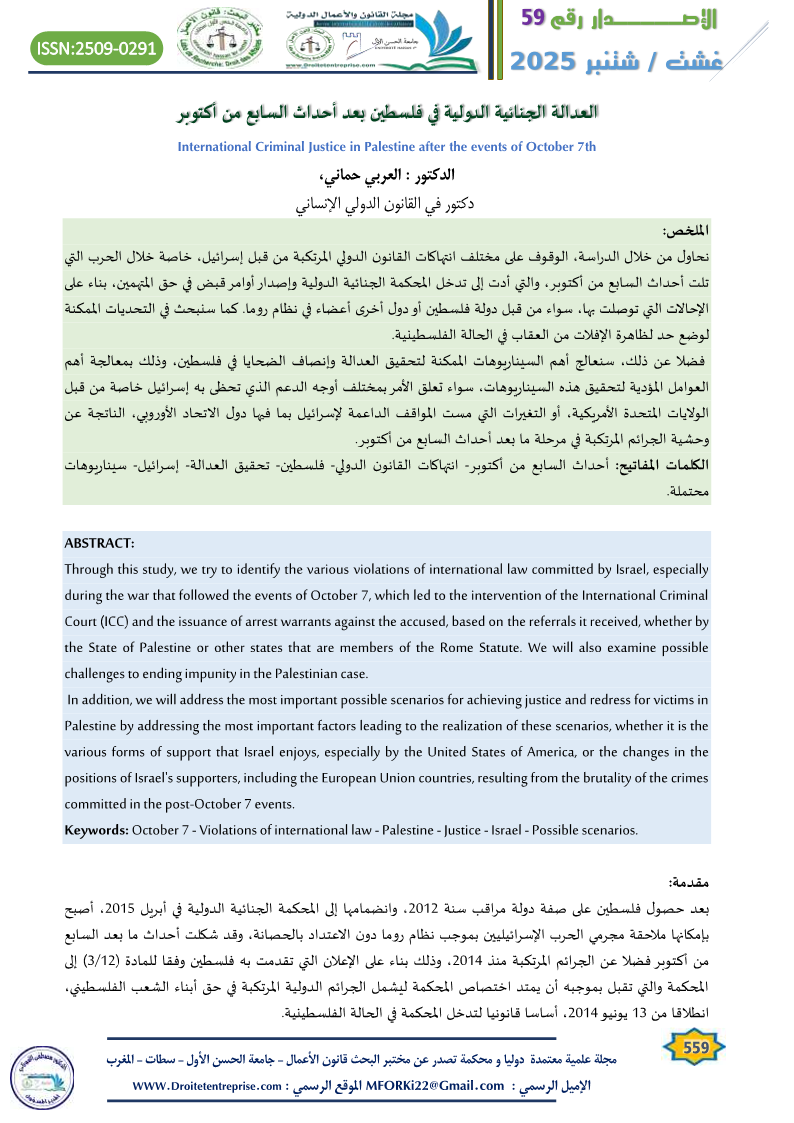 العدالة الجنائية الدولية في فلسطين بعد أحداث السابع من أكتوبر الدكتور : العربي حماني،