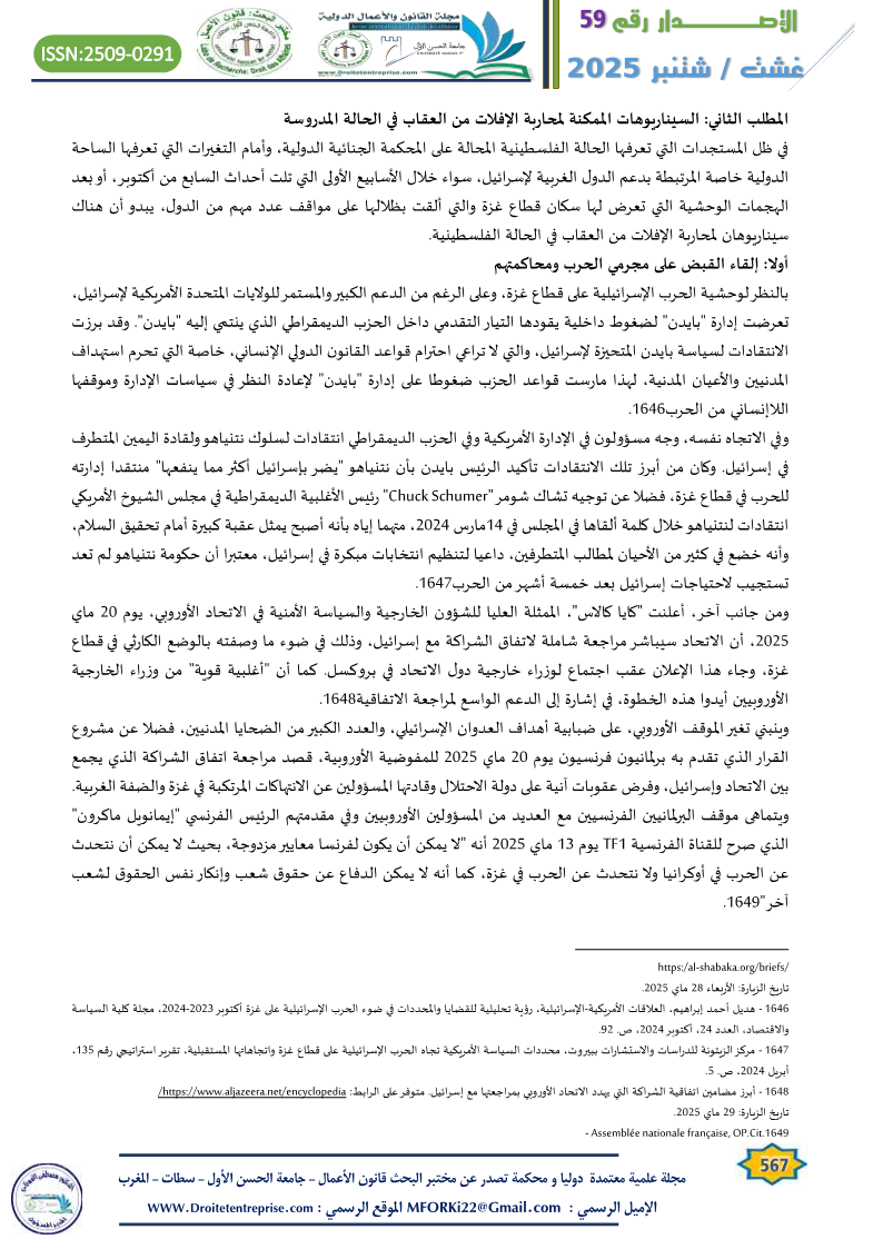 فضلا عن ذلك، سنعالج أهم السيناريوهات الممكنة لتحقيق العدالة وإنصاف الضحايا في فلسطين، وذلك بمعالجة أهم العوامل المؤدية لتحقيق هذه السيناريوهات، سواء تعلق الأمر بمختلف أوجه الدعم الذي تحظى به إسرائيل خاصة من قبل الولايات المتحدة الأمريكية، أو التغيرات التي مست المواقف الداعمة لإسرائيل بما فيها دول الاتحاد الأوروبي، الناتجة عن وحشية الجرائم المرتكبة في مرحلة ما بعد أحداث السابع من أكتوبر.