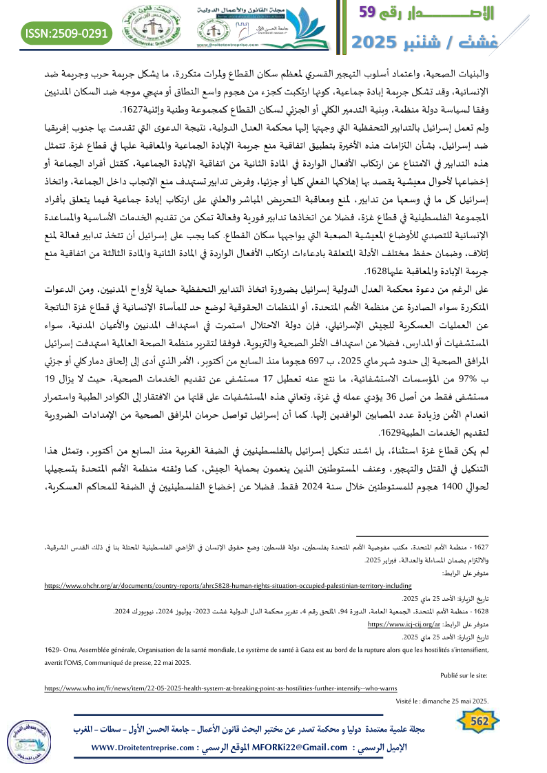 على الرغم من دعوة محكمة العدل الدولية إسرائيل بضرورة اتخاذ التدابير التحفظية حماية لأرواح المدنيين، ومن الدعوات المتكررة سواء الصادرة عن منظمة الأمم المتحدة، أو المنظمات الحقوقية لوضع حد للمأساة الإنسانية في قطاع غزة الناتجة عن العمليات العسكرية للجيش الإسرائيلي، فإن دولة الاحتلال استمرت في استهداف المدنيين والأعيان المدنية، سواء المستشفيات أو المدارس، فضلا عن استهداف الأطر الصحية والتربوية، فوفقا لتقرير منظمة الصحة العالمية استهدفت إسرائيل المرافق الصحية إلى حدود شهر ماي 2025، ب 697 هجوما منذ السابع من أكتوبر، الأمر الذي أدى إلى إلحاق دمار كلي أو جزئي ب %97 من المؤسسات الاستشفائية، ما نتج عنه تعطيل 17 مستشفى عن تقديم الخدمات الصحية، حيث لا يزال 19 مستشفى فقط من أصل 36 يؤدي عمله في غزة، وتعاني هذه المستشفيات على قلتها من الافتقار إلى الكوادر الطبية واستمرار انعدام الأمن وزيادة عدد المصابين الوافدين إليها. كما أن إسرائيل تواصل حرمان المرافق الصحية من الإمدادات الضرورية لتقديم الخدمات الطبية.