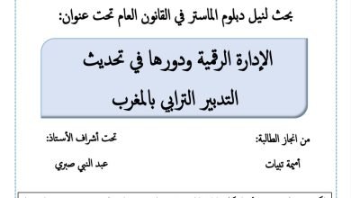 📊 معلومات عن الملف الخاصيةالتفاصيل📂 نوع الملفPDF (بحث / دراسة)📄 عدد الصفحاتحوالي 92 صفحة⚖️ التخصصالإدارة المغربية / الإدارة الإلكترونية والرقمنة👤…
