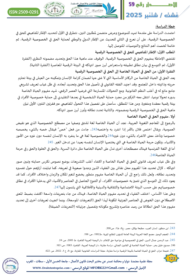وتروم الدراسة الكشف عن المفهوم الدقيق للحق في الخصوصية الرقمية، وتحديد مجالاته وحدوده، واستعراض أبرز صور انتهاكه في العصر الرقمي، إلى جانب تحليل أهم المواثيق الدولية والتشريعات الوطنية، ولا سيما المغربية، ذات الصلة بتكريس هذا الحق وضمان حمايته القانونية.