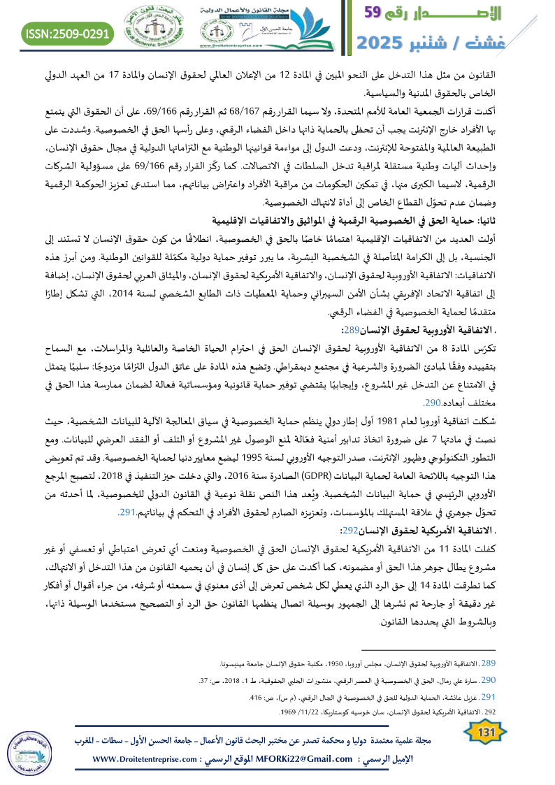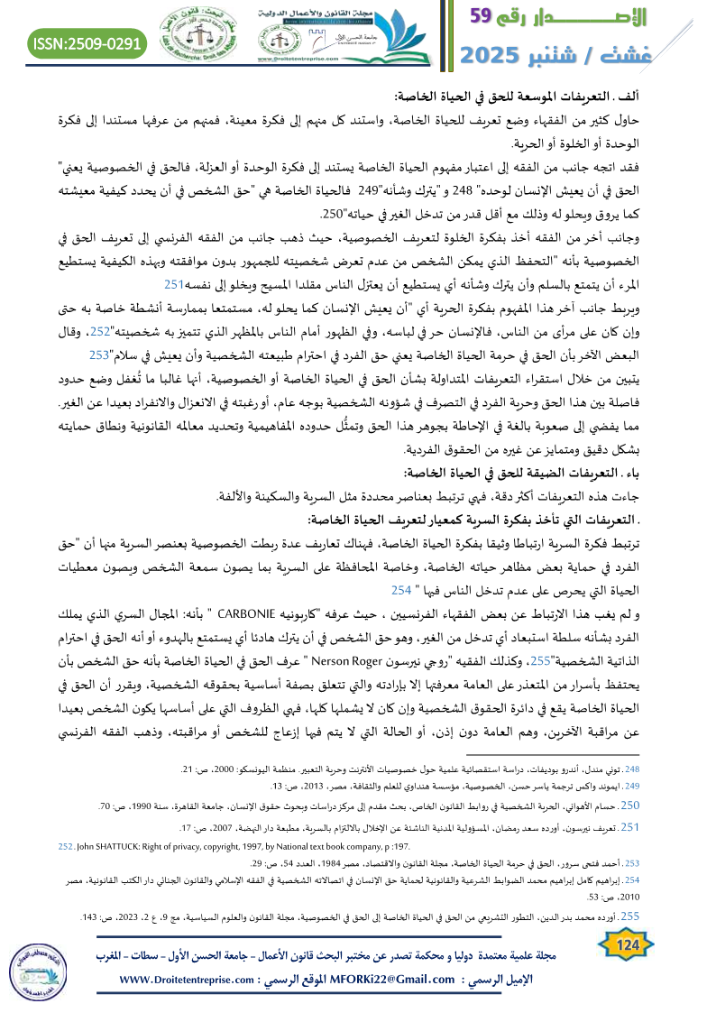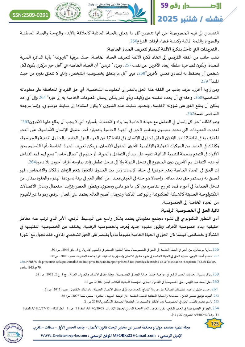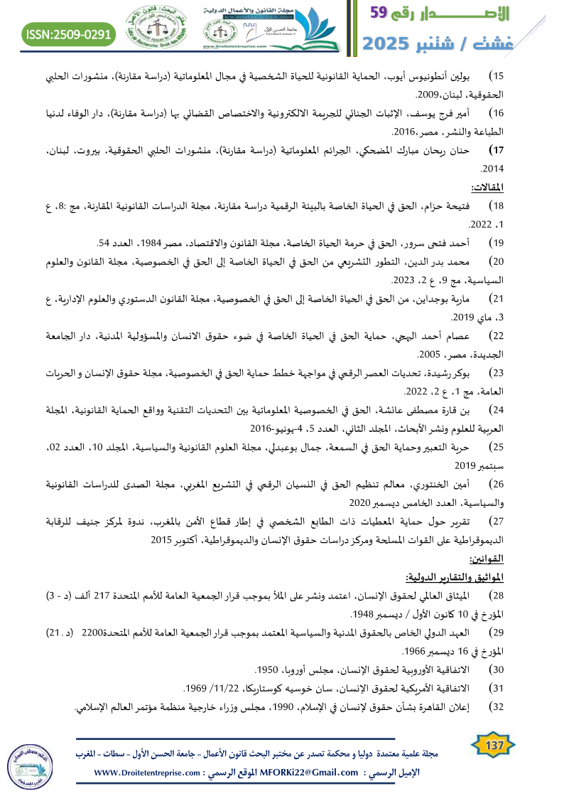 - محمد بدر الدين، التطور التشريعي من الحق في الحياة الخاصة إلى الحق في الخصوصية، مجلة القانون والعلوم السياسية، مج 9، ع 2، 2023.