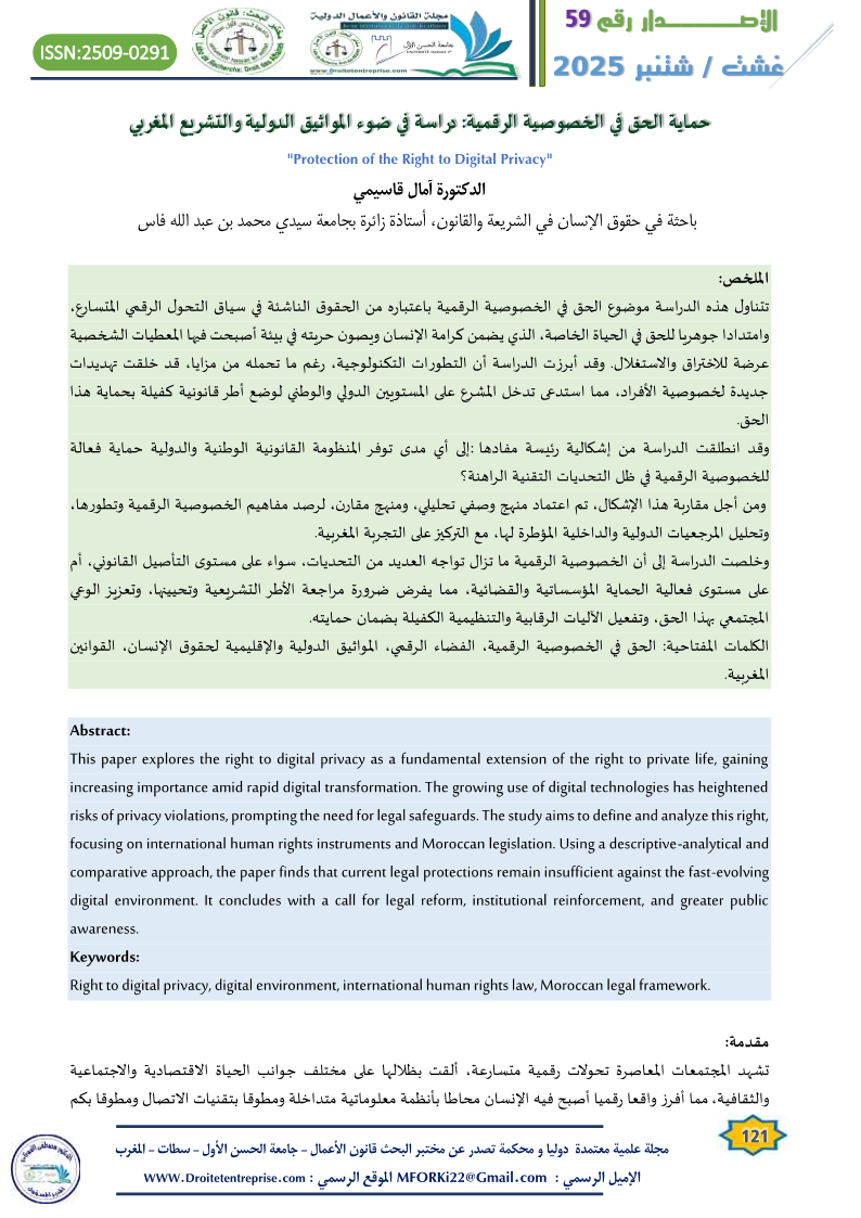 حماية الحق في الخصوصية الرقمية: دراسة في ضوء المواثيق الدولية والتشريع المغربي – الدكتورة آمال قاسيمي