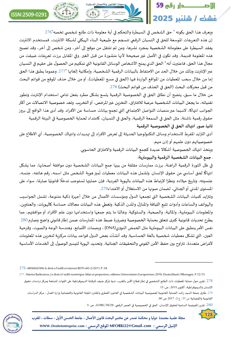 - أمين الخنتوري، معالم تنظيم الحق في النسيان الرقمي في التشريع المغربي، مجلة الصدى للدراسات القانونية والسياسية، العدد الخامس ديسمبر 2020