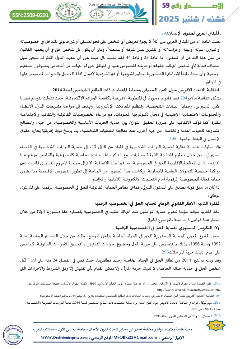 الكلمات المفتاحية: الحق في الخصوصية الرقمية، الفضاء الرقمي، المواثيق الدولية والإقليمية لحقوق الإنسان، القوانين المغربية.