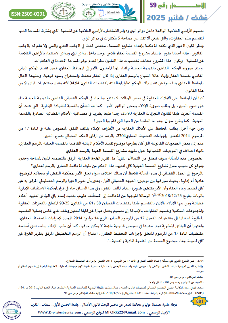 ونظرا لكون الخبير الذي تكلفه المحكمة بإعداد مشاريع القسمة، مختص فقط في الجانب التقني والفني ولا علم له بالجانب القانوني، فإنه أحيانا يقوم بإعداد مشروع القسمة لعقار فلاحي يوجد داخل دوائر الري ودوائر الاستثمار بالأراضي الفلاحية غير المسقية ويكون هذا المشروع مخالف لمقتضيات هذا القانون نظرا لعدم توفر المساحة المحددة في 5هكتارات.