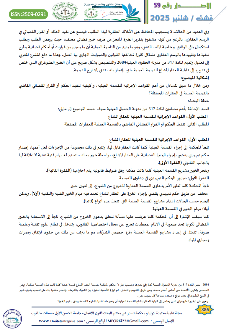 ونظرا لكون هذه العملية عمل مادي تقني يتم من خلالها وضع حد لشياع وفرز حصص الشركاء، مع ما يترتب عن ذلك من حقوق ارتفاق وممرات ومجاري المياه، فهو عمل مادي تقني محض لا تستطيع المحكمة القيام به بمفردها لانعدام المؤهلات الفنية والتقنية لديها في هذا الجانب، لذلك تلجأ إلى الاستعانة بدوي الاختصاص قصد تنويرها في المسائل التقنية التي لا علاقة لها بالقانون، عن طريق اصدار حكم تمهيدي يقضي بإجراء الخبرة على العقار من خلال تكليف الخبير المختص بمهمة التأكد مما إذا كان العقار قابل للقسمة العينية وتحديد مشاريع القسمة العينية في تقرير الخبرة بشكل دقيق كلما كانت ممكنة، وإيداعه بكتابة الضبط المحكمة التي أمرت بإجراء الخبرة داخل الأجل المحدد له في الحكم التمهيدي، وتصدر المحكمة حكمها بناء على هذا التقرير كما كان منجز وفق الشروط الشكلية والموضوعية، واحترم فيه الخبير المهمة المحددة له في الحكم التمهيدي من طرف المحكمة التي لها كامل السلطة التقديرية تجاه هذا التقرير.