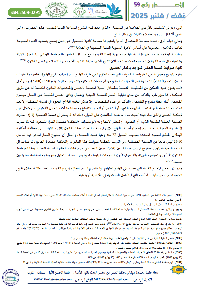 وعليه فالمحكمة ملزمة بضورة تنبيه الخبير بضرورة إنجاز القسمة مع مراعاة القوانين والضوابط الجاري بها العمل، وخاصة مثل هذه القوانين الخاصة تحث طائلة بطلان تقرير الخبرة طبقا للفقرة الأخيرة من المادة 9 من نفس القانون.()