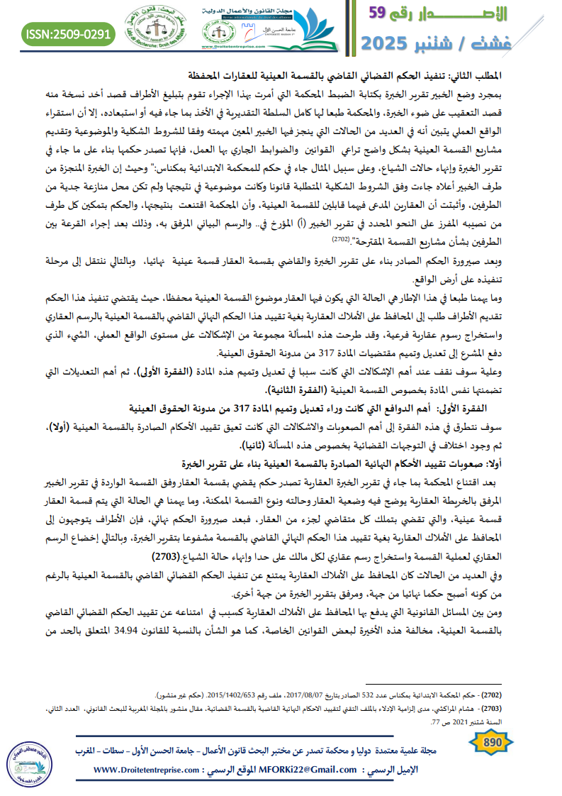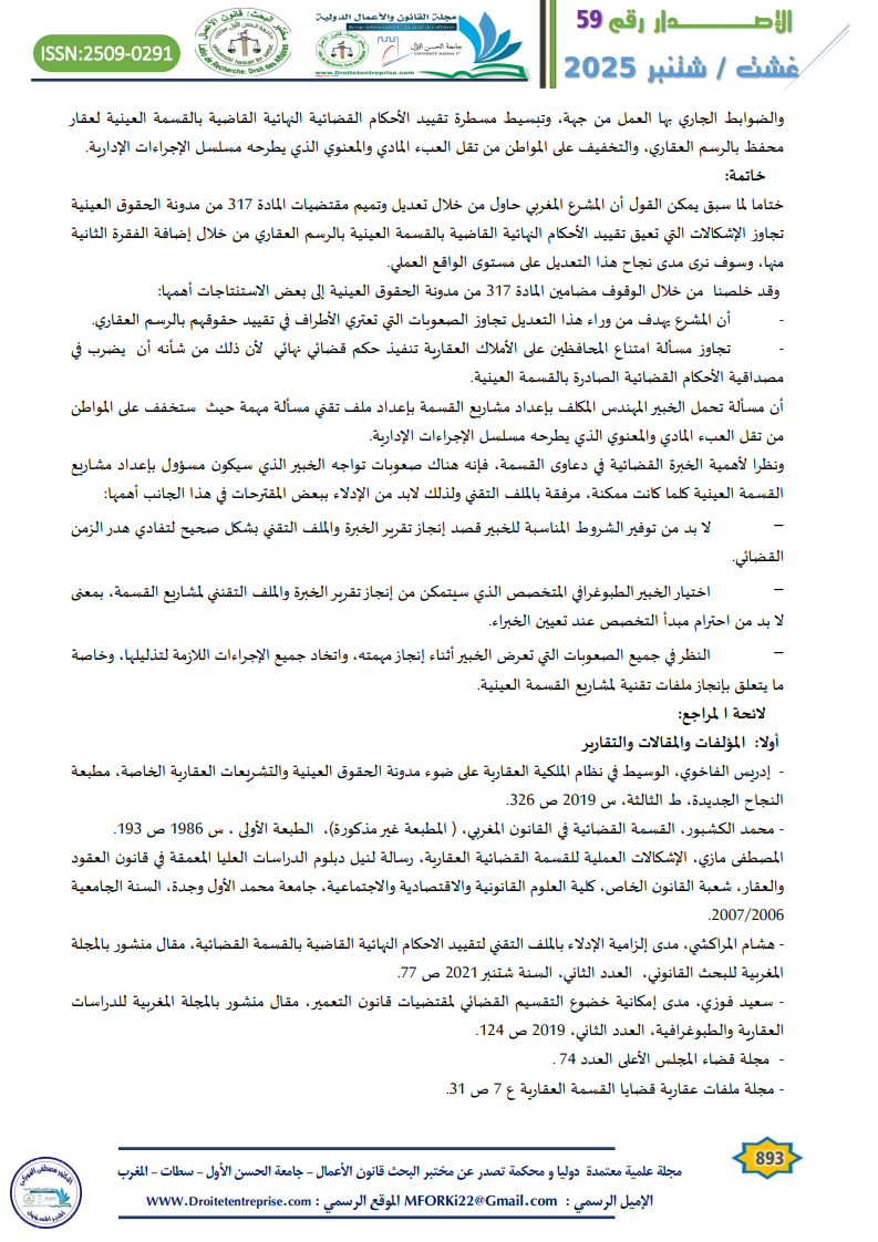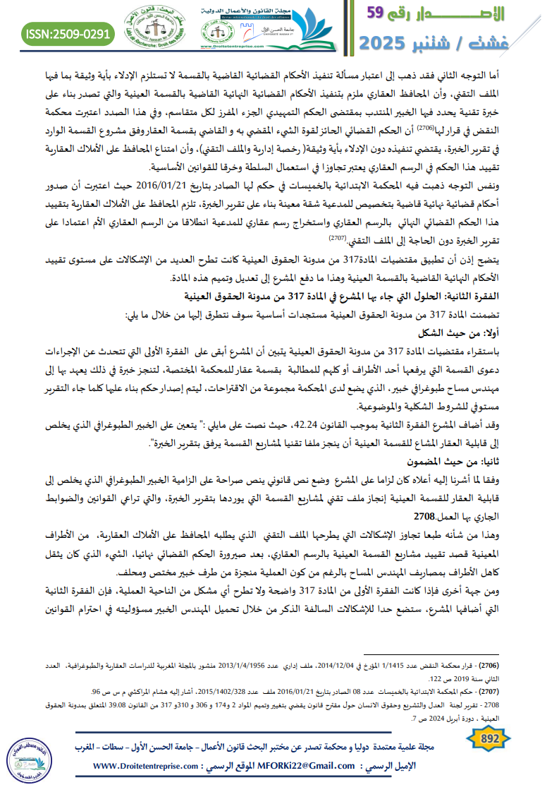 ومن جهة أخرى فإذا كانت الفقرة الأولى من المادة 317 واضحة ولا تطرح أي مشكل من الناحية العملية، فإن الفقرة الثانية التي أضافها المشرع، ستضع حدا للإشكالات السالفة الذكر من خلال تحميل المهندس الخبير مسؤوليته في احترام القوانين والضوابط الجاري بها العمل من جهة، وتبسيط مسطرة تقييد الأحكام القضائية النهائية القاضية بالقسمة العينية لعقار محفظ بالرسم العقاري، والتخفيف على المواطن من تقل العبء المادي والمعنوي الذي يطرحه مسلسل الإجراءات الإدارية.