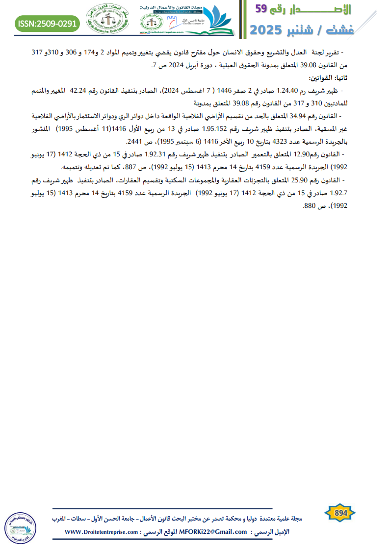 – تقرير لجنة العدل والتشريع وحقوق الانسان حول مقترح قانون يقضي بتغيير وتميم المواد 2 و174 و 306 و 310و 317 من القانون 39.08 المتعلق بمدونة الحقوق العينية ، دورة أبريل 2024 ص 7.
