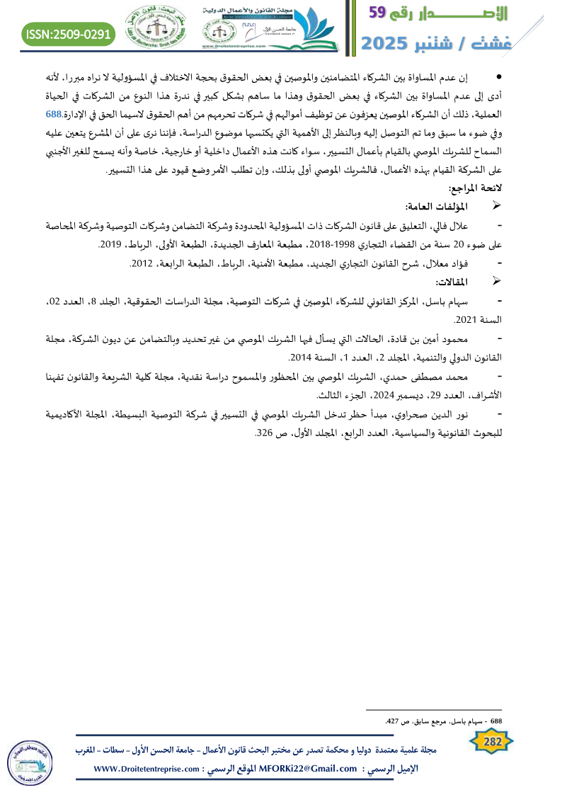 - سهام باسل، المركز القانوني للشركاء الموصين في شركات التوصية، مجلة الدراسات الحقوقية، الجلد 8، العدد 02، السنة 2021.